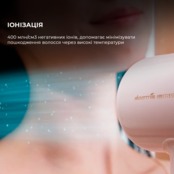 Во время работы фена встроенный генератор производит несколько тысяч негативных ионов ежесекундно и помещает их в исходящий поток воздуха. Таким образом крупные молекулы воды разделяются на более мелкие и испаряются гораздо быстрее. Также ионизация сглаживает кутикулы волос, делая их более блестящими, здоровыми и послушными. Больше никакого пушения прядей после сушки волос.
