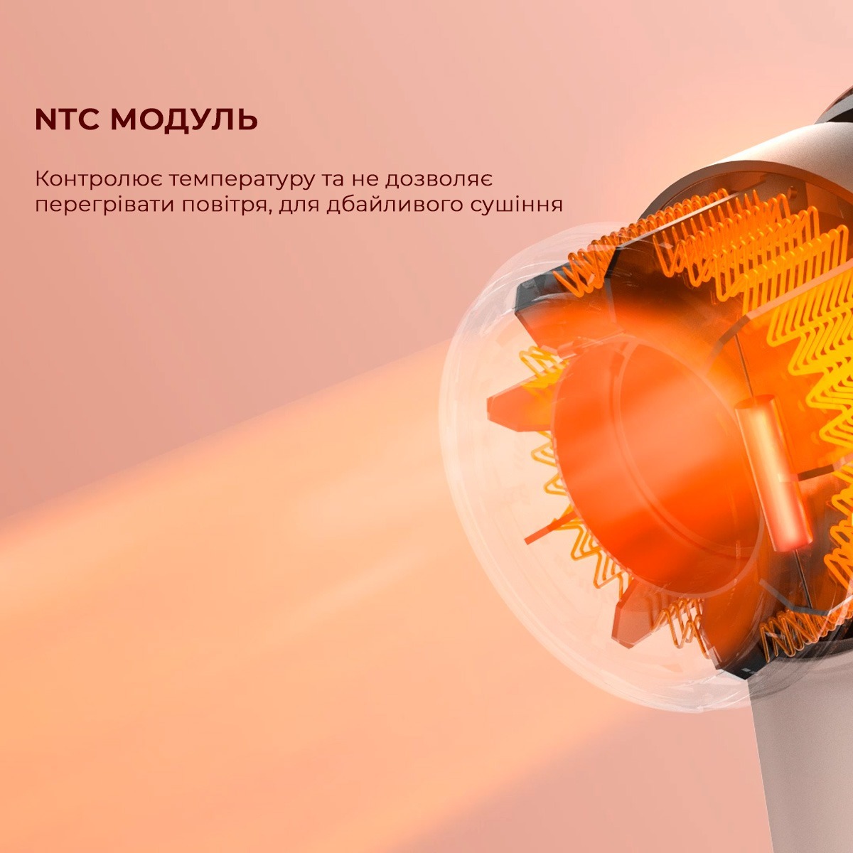 Внутри рукоятки фена Deerma DEM-CF50W размещены мотор, турбовентилятор, нагревательный элемент и система цифрового управления работой фена. Турбина имеет 13-ти лопастную крыльчатку, которая способна прокачивать большое количество воздуха для его разогрева и быстрого высушивания волос на голове.