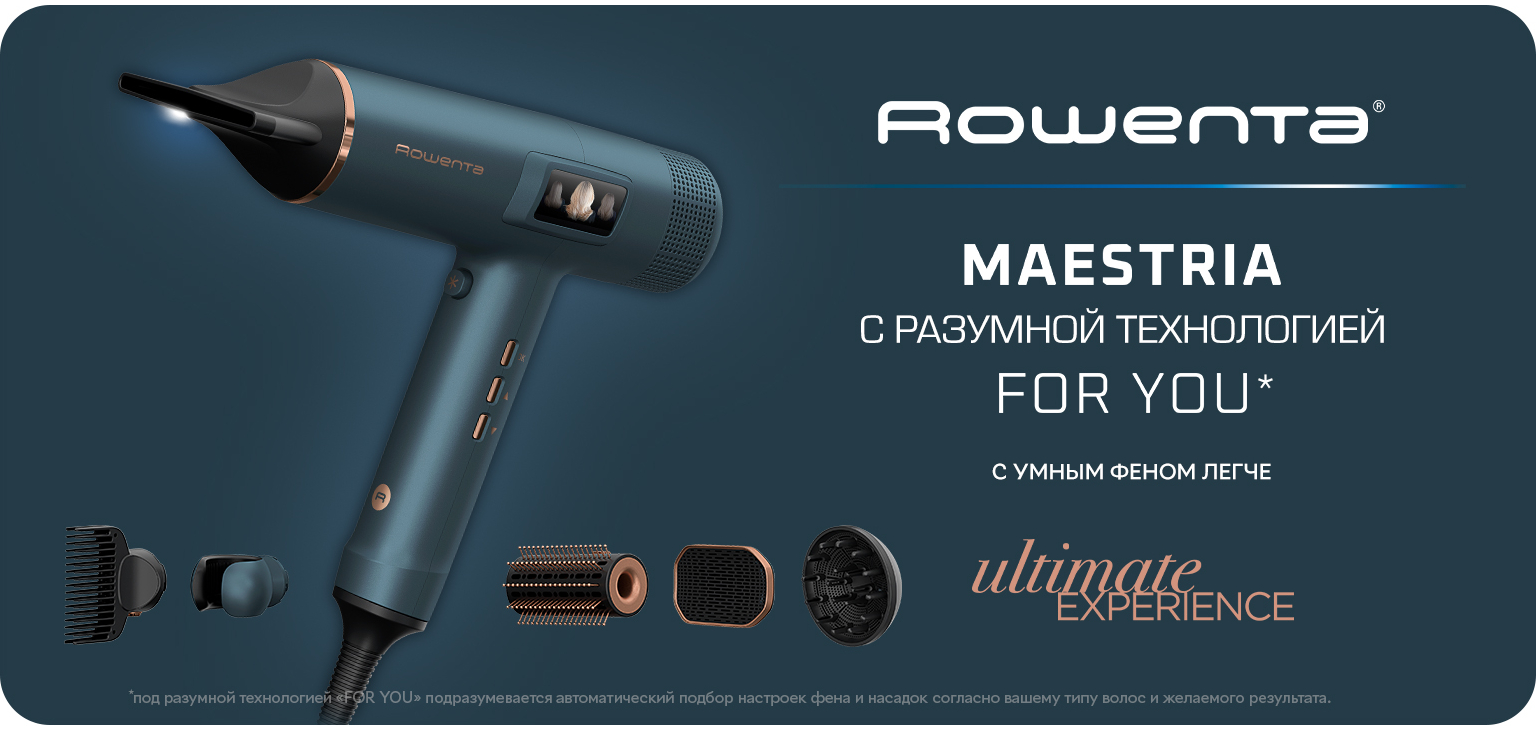 Самая современная технология для сушки и укладки волос автоматически адаптируется к типу волос и вашим личным потребностям. Высокоскоростная технология двигателя Rowenta обеспечивает быструю и эффективную сушку волос со скоростью воздушного потока до 225 км/ч. Главной особенностью новой модели — есть дисплей. Благодаря подсказкам вы сможете подобрать конкретно тот режим, который позволит вам создать желаемую прическу. А для комфортного хранения в комплекте идет высококачественная сумка, в которой удобно хранить и брать с собой в путешествие не только фен Maestria, но и все аксессуары к нему.
