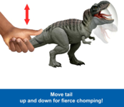 Нажмите на его язык, чтобы услышать громкий победный рев. Удерживайте его дольше, и активируется режим неистовства: хищник будет непрерывно щелкать челюстями, сопровождая это светом и звуками. Крутя его хвост наблюдайте, как голова динозавра поднимается, опускается или поворачивается, а его огромная пасть раскрывается для смертельного укуса.