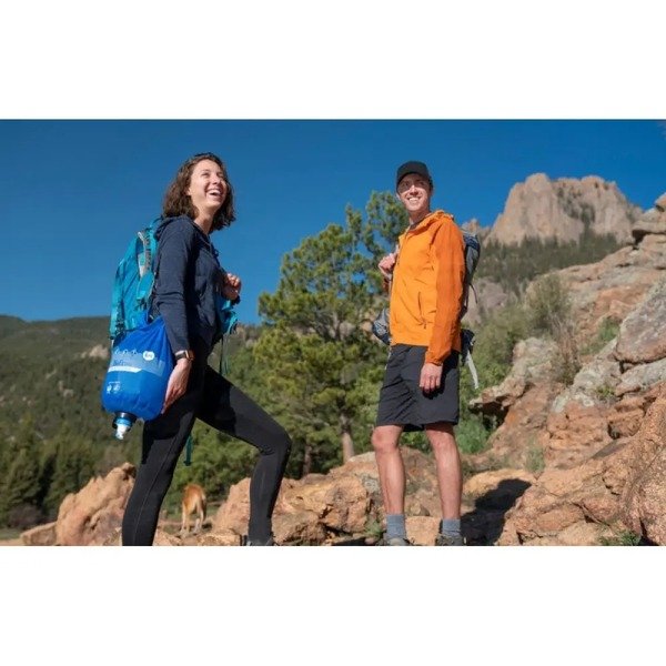 - Резервуар в сложенном виде практически не занимает места и весит всего 263 г (6 л) или 284 г (10 л). Его удобно наполнять в реке, озере или ручье через отверстие с роллтоп-застежкой. Роллтоп позволяет убрать лишний воздух, чтобы при переноске содержимое не плескалось.
