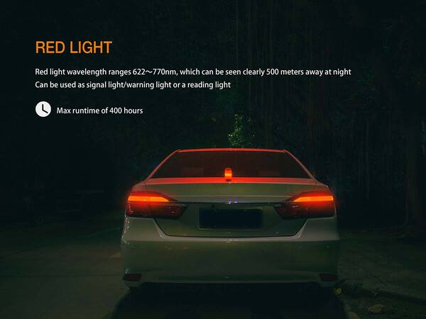 - Красные вспышки: фонарь работает с яркостью 1 люмен на протяжении 400 часов без подзарядки.