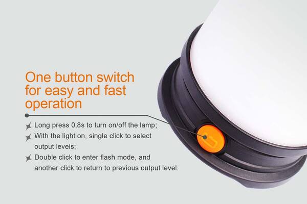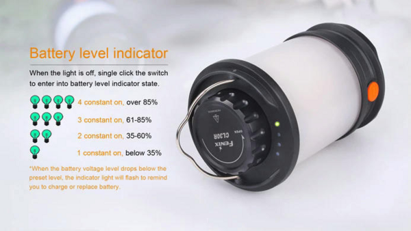 Чтобы включить или выключить кемпинговый фонарь, кнопку необходимо удерживать нажатой в течение 0,8 секунды. Нажмите однократно на кнопку уже работающего фонаря, чтобы выбрать один из доступных режимов. Первым включается тот уровень яркости, который был активен при прошлом включении. Последовательность смены режимов - с возрастающей яркостью. С помощью кнопки также можно проверить уровень заряда аккумулятора. Для этого нужно однократно коротко нажать на кнопку выключенного фонаря. Если загорится одна лампочка индикатора, то уровень заряда батарей составляет около 35%. Две лампочки соответствуют 36-60% заряда. Три лампочки - 61-85% заряда. Если же будут светиться все четыре лампочки, значит, уровень заряда превышает 85%. Все индикаторы автоматически отключатся через 8 секунд. Если же уровень заряда опустится ниже критической отметки, то индикаторы в кнопке начнут мигать. Однако эта функция доступна только в том случае, когда используются аккумуляторы с выпуклым анодом.