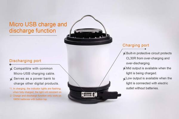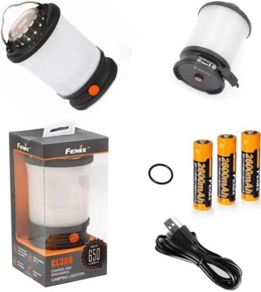 Модель Fenix CL30R разработана для кемпингов и палаточных туристических стоянок. Поэтому она выполнена в форме, напоминающей старинный фонарь, свет от которого равномерно расходится во всех направлениях. В то же время для нее используются все необходимые современные технологии, которые делают этот фонарь удобным и долговечным. В модели Fenix CL30R используются мощные светодиоды, что позволило увеличить ее яркость до 650 люмен. В качестве рассеивающей линзы выступает практически весь корпус фонаря, через который свет равномерно рассеивается в диаметре 35 метров.