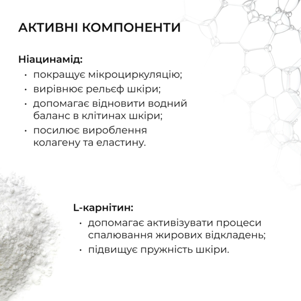 L-карнитин активно способствует процессам сжигания жировых отложений, помогая уменьшить проявления целлюлита. Он также повышает упругость кожи, делая ее более эластичной и подтянутой.