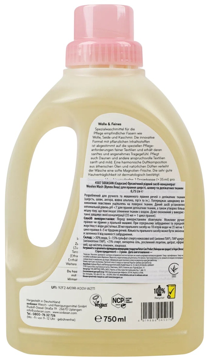 - Гель для стирки Sodasan Woolen Wash для шерсти и шелка жидкий 750 мл