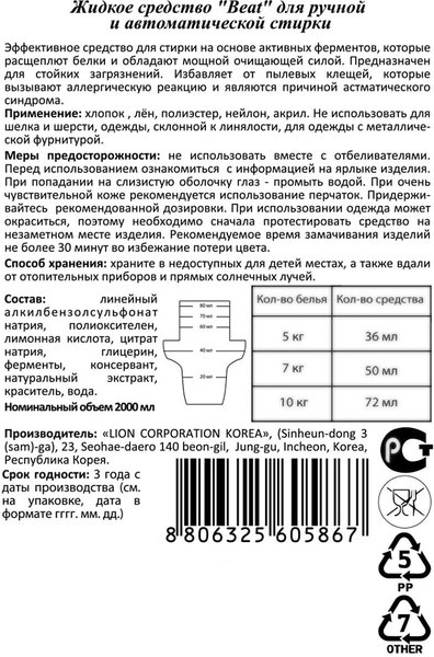 Жидкое концентрированное стиральное средство Lion Beat Drum, 2 л