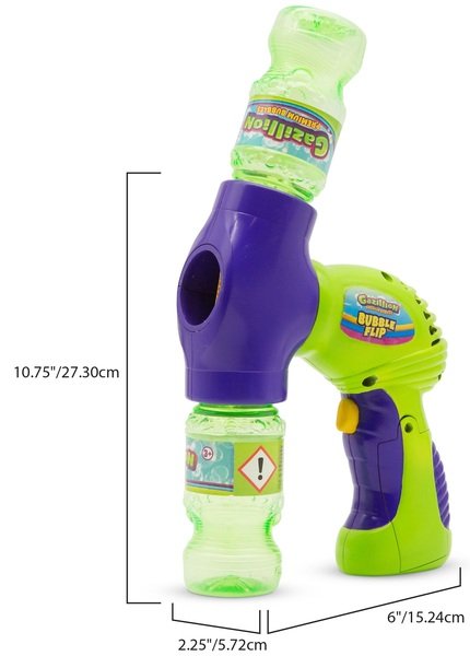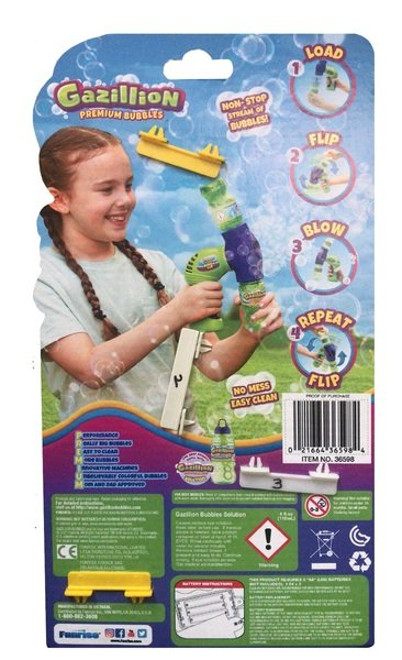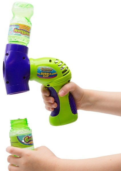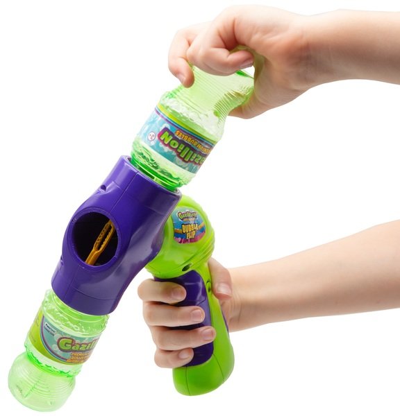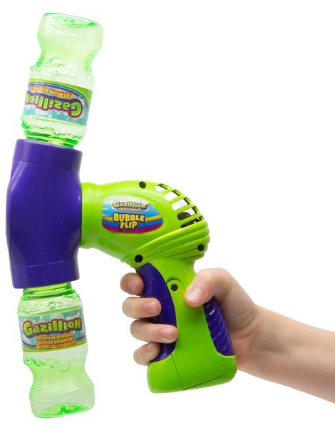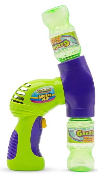 Представляем Gazillion Bubbles Bubble Flip для безостановочного потока пузырей! С флип-дизайном веселье с пузырями никогда не заканчивается! Загрузите, скручивая 4 унции. Бутылка с раствором в бластер для пузырей, после полного нажатия на спусковой крючок, чтобы начать выдувать поток пузырей. Как только бутылка опустеет, переверните переднюю часть бластера, используйте бутылку в качестве ручки и снова нажмите на курок, чтобы увеличить количество пузырей! Каждый Bubble Flip включает в себя бутылку раствора Gazillion Bubbles Solution.