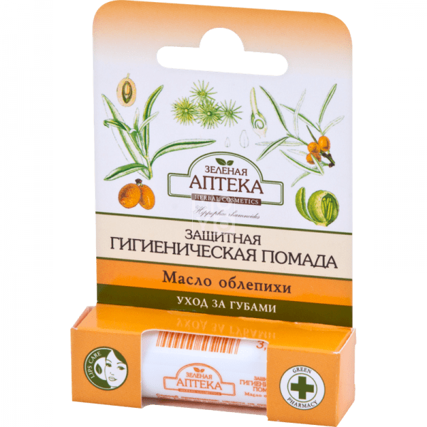 Гигиеническая помада Зеленая аптека с маслом облепихи 3,6 гр. - предназначена для комплексного эффективного ухода за губами. В этой помаде содержатся натуральные растительные масла, обеспечивающие тонкой чувствительной коже губ надежную защиту от вредных факторов внешней среды. Помада особенно рекомендована для ухода за поврежденной кожей губ, она обеспечивает активное питание и смягчение.