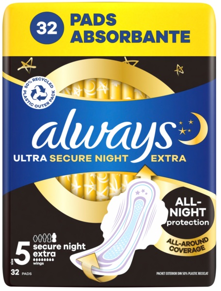 Гигиенические прокладки Always Ultra Secure Night Extra с крылышками обеспечивают тройную защиту в течение всей ночи, поэтому Вам не придется просыпаться из-за протекания или менять прокладку в течение ночи. Благодаря на 9% большей передней и на 85% задней части и технологии LeakGuard, они полностью впитывают влагу, надежно защищая от протеканий во время ночного сна. Система InstantDry мгновенно впитывает влагу и надежно удерживает ее внутри. Технология OdourLock нейтрализует неприятные запахи, даря ощущение непревзойденной чистоты и свежести. Прокладки Always Ultra обеспечивают тройную защиту. Дерматологически проверены и одобрены ассоциацией Skin Health Alliance (Скин Хелс Альянс). Найди свой идеальный размер вместе с Always Ultra, системой персонализированного подбора размера, которая поможет тебе найти лучшую защиту Always для критических дней в соответствии с интенсивностью выделений и размера белья.