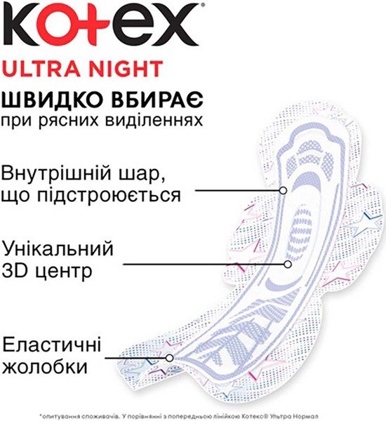 Гигиенические прокладки Kotex (Котекс) Ultra Night с покрытием "сеточка" обеспечат максимальную защиту и комфорт во время критических дней.