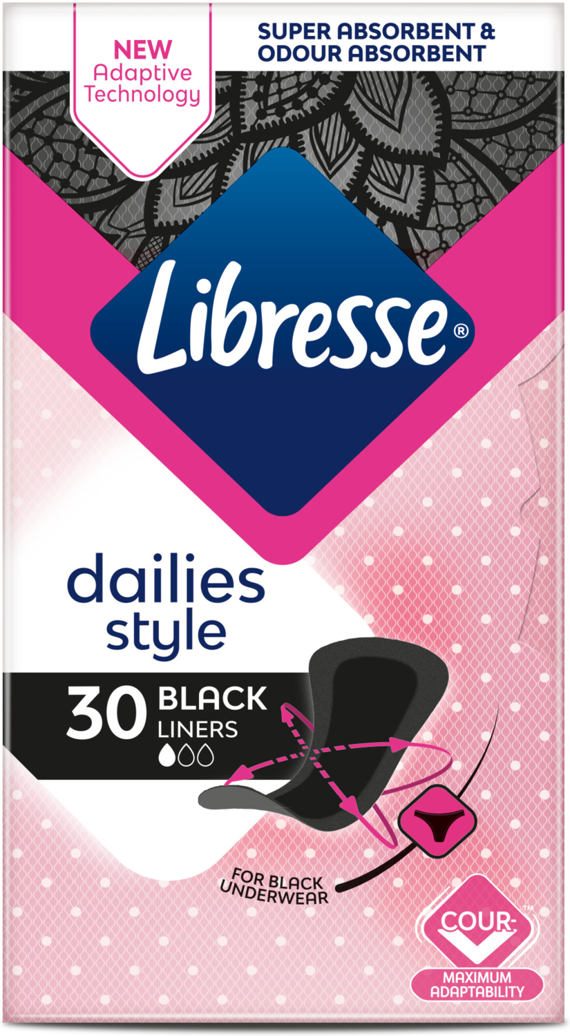 Ультратонкие ежедневные прокладки Libresse Dailies Style обеспечивают свежесть и защиту на весь день. Наши ежедневные прокладки Black идеально подходят для черного белья. Пакет изготовлен на 100% из возобновляемых волокон.