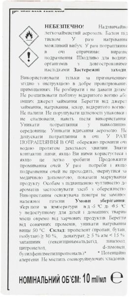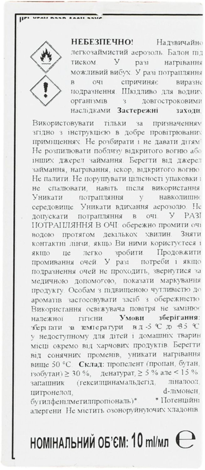 | Состав | Пропеллент (пропан, бутан, изобутан) ≥ 30%, денатурат, ≥ 5%, но <15%: отдушка (гексилцинамальдегид, линалоол, цитронеллол, d-лимонен, бутилфенилметилпропиональ) |