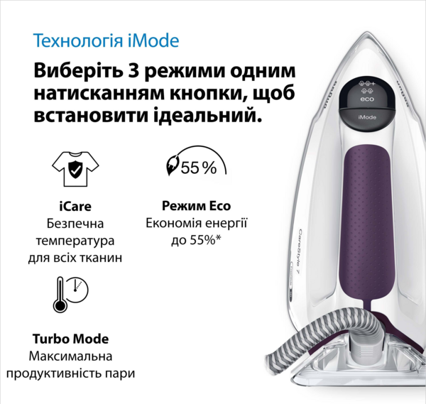 Благодаря новому интерфейсу iMode все режимы глажки будут под рукой. Выберите один из 3 режимов одним нажатием кнопки во время глажки.