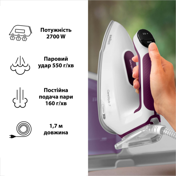 Возможностей стандартного бытового утюга бывает недостаточно, если речь идет о масштабной стирке с приведением вещей в надлежащий вид. А это совсем не редкость в большой семье с детьми. Отличным решением в такой ситуации станет новый подход к уходу за вещами - покупка системы глажки Braun! Применение современных технологий глажки, повышенная мощность, большой запас воды и дополнительный функционал позволят вам забыть об усталости, гладить быстро и качественно, даже если вещей накопилось много. Утюг обеспечивает по-настоящему комфортную глажку без усилий.