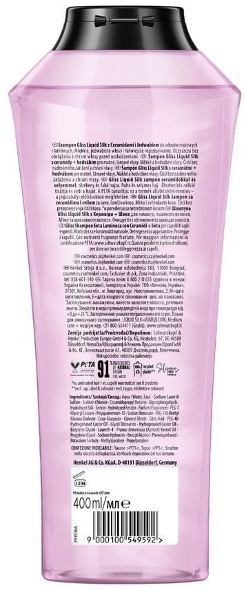 | Состав | Aqua (Water, Eau), Sodium Laureth Sulfate, Sodium Chloride, Cocamidopropyl Betaine, Glycosphingolipids, Hydrolyzed Silk, Sericin, Hydrolyzed Keratin, Parfum (Fragrance), PEG-7 Glyceryl Cocoate, Polyquaternium-10, Sodium Benzoate, PEG-120 Methyl Glucose Dioleate, Coco-Glucoside, Glyceryl Oleate, Citric Acid, PEG-40 Hydrogenated Castor Oil, Glycol Distearate, Hydrogenated Castor Oil, Butylene Glycol, Laureth-4, Prunus Armeniaca (Apricot) Kernel Oil, Propylene Glycol, Sodium Hydroxide, Benzyl Alcohol, Phenoxyethanol, Potassium Sorbate, Methylparaben, Propylparaben |