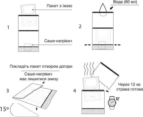 Кроме упаковки с самим блюдом, в комплект входит пакет с нагревательным саше. Он помогает быстро разогреть продукт без использования открытого огня и туристических принадлежностей. Нагреватель активируется при контакте с водой.