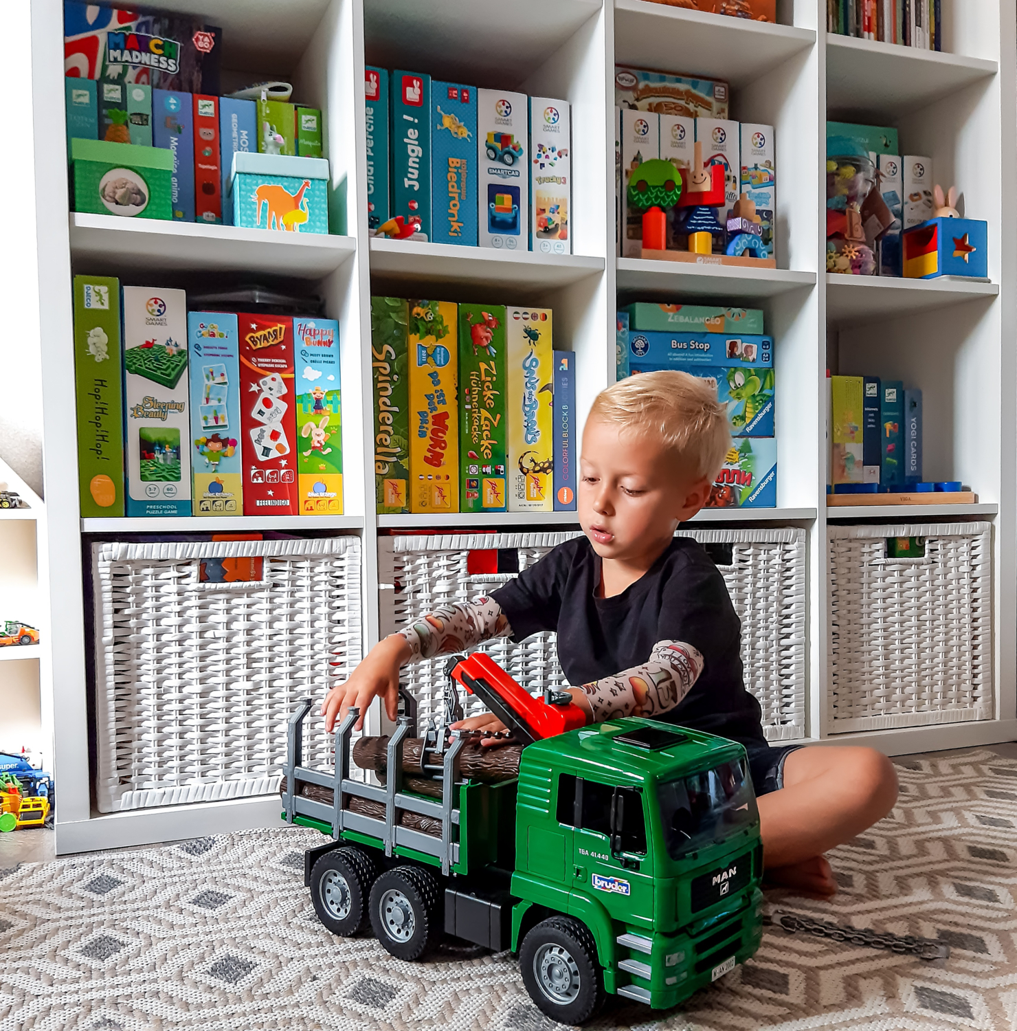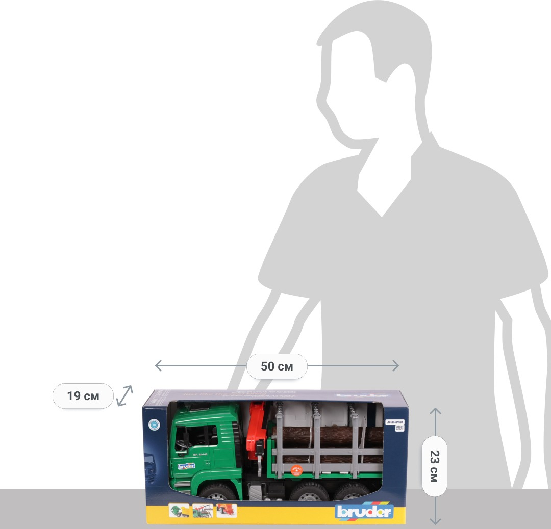 - Грузовик BRUDER 1:16 MAN перевозчик брёвен с краном-погрузчиком (2769)