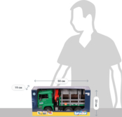 - Руль в кабине вращается;на кабине небольшая лесенка;шесть мощных колес из мягкого пластика.