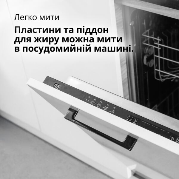 Встроенный поддон для жира отводит излишки масла во время приготовления, помогая вам создавать более здоровые блюда. Наклонная конструкция пластин позволяет излишку масла стекать в поддон, а не на вашу еду. Поддон также легко снимается и подходит для мытья в посудомоечной машине, что обеспечивает чрезвычайно простую очистку.
