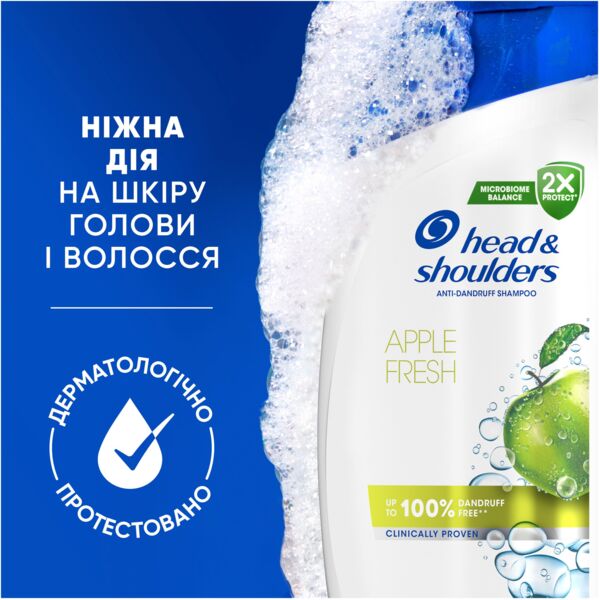 Head & Shoulders шампунь против перхоти устраняет основную причину перхоти, обеспечивая защиту от шелушения, зуда и сухости на срок до 72 часов (видимые чешуйки перхоти, при регулярном применении; зуд, вызванный перхотью). Его усовершенствованная формула, протестированная дерматологами, сбалансирована по pH, усилена антиоксидантами для бережного ухода за волосами и кожей головы и обеспечивает до 100% свободы от перхоти — доказано клинически (при регулярном применении). Шампунь против перхоти Яблочная свежесть эффективно очищает волосы, даря вам ощущение свежести и приятный яблочный аромат.