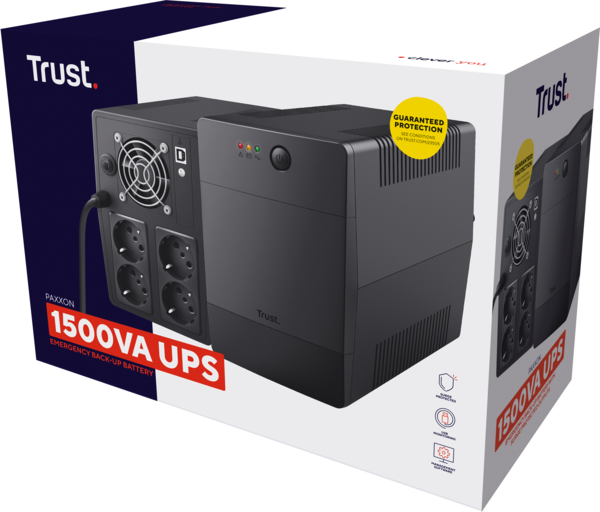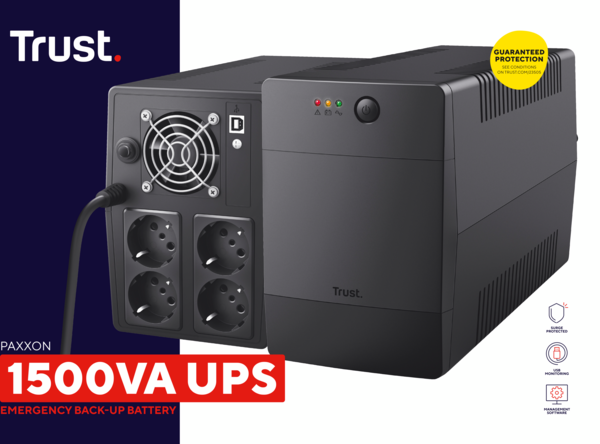 Вы можете быть спокойны, зная, что Trust Paxxon 1500VA присматривает за вашими устройствами. Надежный ИБП является идеальным вторичным источником питания для вашей электроники, обеспечивая ее временную работу во время отключения электроэнергии и защищая ее от повреждений, вызванных скачками напряжения.