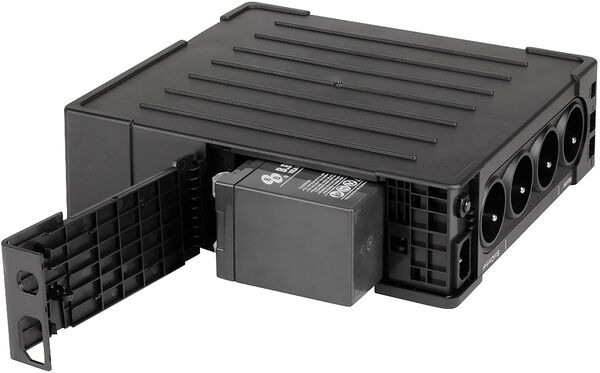 Чрезвычайно плоская конструкция этого бесперебойника упрощает его установку в любой офисной среде. Варианты установки следующие: вертикально под рабочим столом, горизонтально под монитором, монтаж в 19-дюймовом стеллаже (дополнительный набор крепления 2U) и монтаж на стену (дополнительное крепление).