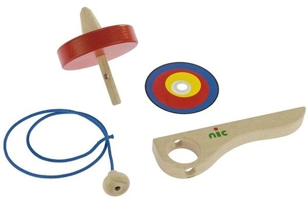 Игра и познание мира возможно вместе с деревянной волчком для детей. Развивающая игрушка немецкого производителя игрушек nic поставляется без упаковки. Она произведена из натурального дерева. Объемный диск (Ø 85 мм) покрыт красной краской на водной основе. На ручке размещен цветной логотип немецкого бренда. Шнурок, которым раскручивается волчок, произведенный из текстиля голубого цвета. Чтобы запустить волчок, необходимо протянуть стержень игрушки через маленькие отверстия большой ручки. Затем взять голубой шнурок, немного протащить его через маленький отверстие стержня. После чего, взяться за красный диск и накрутить веревку. Ставим игрушку на ровную поверхность и тянем за шнурок, одновременно снимая большую ручку. Интерактивная игрушка предназначена для детей от 4-х лет. Такой волчок даст фору любом Блэйду и главное он экологичен и безопасен для детей.