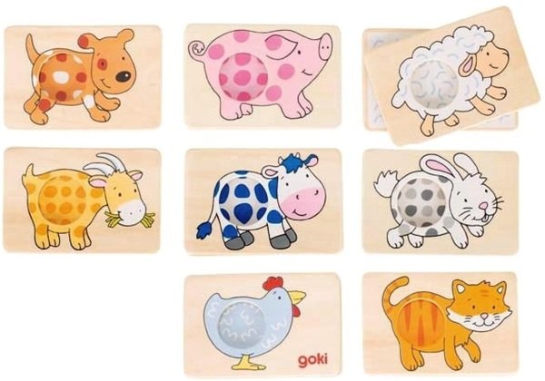 Игрушки фирмы goki беру не первый раз, ребенок всегда проявляет интерес. Мне нравится, что цены не высокие, можно найти много развивающих наборов, как например эта игра-мемо - Животные. Главное, что правила не заумные, качество деталей высокое, ребенок может играться ими не раз и не два. Игрушку рекомендую, так как она учит ребенка различать цвета и узоры, а так как тематика "животные" можно изучить их названия, отличия и тренировать с ребенком звуки, которые издает кошка, козочка, курочка и т.д. Пазлы не маленькие - ребенку держать маленькими руками удобно, да и интерес к большим рисункам не пропадает, в отличии от маленьких. Детали из дерева, оно гладкое, легкое, не пахнет лаками и краской