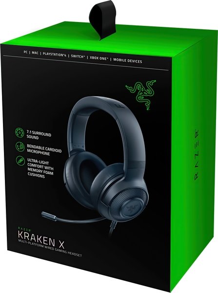 Гарнитура Razer Kraken X совместима с ПК*, Mac, Xbox One*, PS4, Nintendo Switch и мобильными устройствами с аудиоразъемом 3,5 мм.