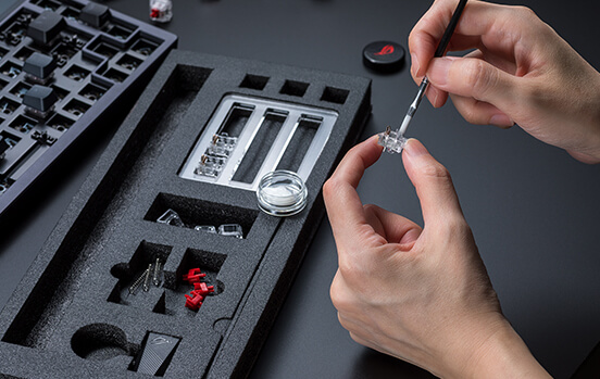 В комплект ROG Azoth входит полный набор инструментов для смазки переключателей. Этот набор включает инструменты для открывания переключателя, снятия колпачка, смазочную станцию, щетку и емкость со смазкой Krytox GPL-205-GD0.