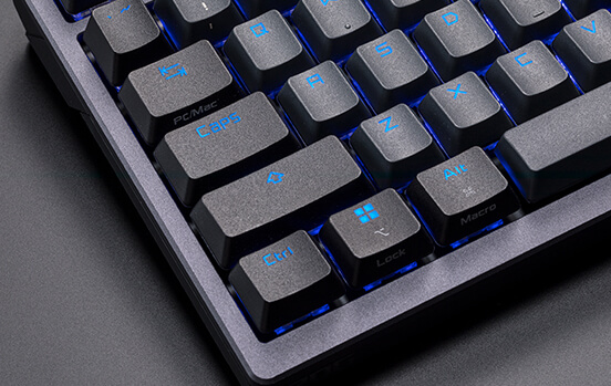 Двухкомпонентные колпачки ROG, изготовленные из PBT-пластика методом литья под давлением, обеспечивают долговечность и тактильные ощущения продукта премиум-класса. Клавиши имеют оптимизированную для игр конструкцию: используются колпачки средней высоты (как у колпачков Cherry) и укороченный шток по сравнению с другими решениями для уменьшения раскачивания клавиш и повышения комфорта пользователя.
