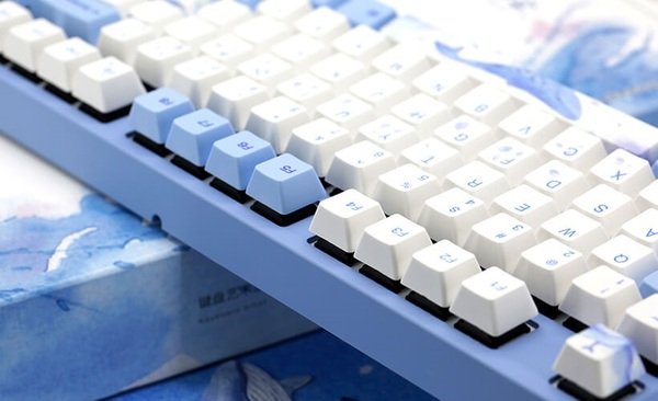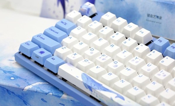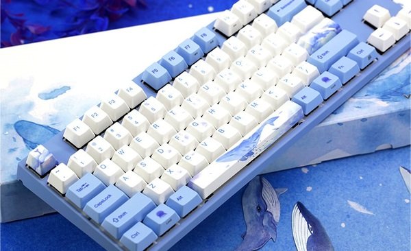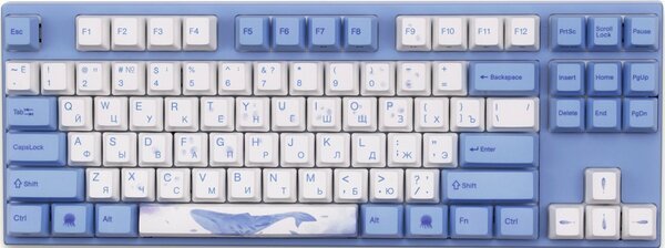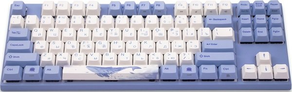 Механическая клавиатура Varmilo привлекает визуальными характеристиками. Она выполнена в приятном нежно-голубом цвете, который мгновенно приковывает к себе внимание. Использование MA87M Sea Melody — возможность подчеркнуть необычность дизайна игрового компьютера. На клавиатуре невероятно красивые клавиши с принтами. Например, на самой большой кнопке («Пробел») изображен кит. Также морские жители нарисованы и на других колпачках переключателей. Компактность производитель сохранил за счет близкого расположения клавиш. Они подсвечиваются световыми диодами. Еще одна особенность — технология N-key roll over, которая используется в высококлассных устройствах ввода. Задача NKRO — обеспечить использование клавишных комбинаций без конфликтов.