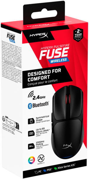 HyperX Pulsefire Fuse имеет изящный амбидекстерный дизайн с текстурированными панелями Microline grip, органично сочетающий комфорт и контроль. Легкий корпус весом всего 75 г, включая батарею, обеспечивает быстрое реагирование и маневренность, позволяя проводить длительные игровые сессии с меньшей усталостью. С Pulsefire Fuse вы можете наслаждаться 85 часами непрерывной игры на одной батарее AAA. Она предлагает настраиваемые предустановки DPI до 12 000 и два варианта беспроводного подключения - 2,4 ГГц или Bluetooth - для универсальной работы. Программное обеспечение HyperX NGENUITY позволяет настраивать уровни DPI, параметры RGB и назначение кнопок, чтобы вы играли так, как вам удобно. Благодаря легкой конструкции и длительному сроку службы аккумулятора HyperX Pulsefire Fuse гарантирует комфортную и стабильную игру без компромиссов.