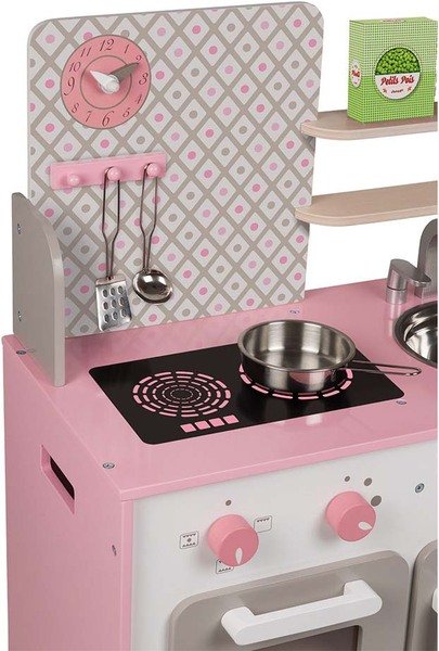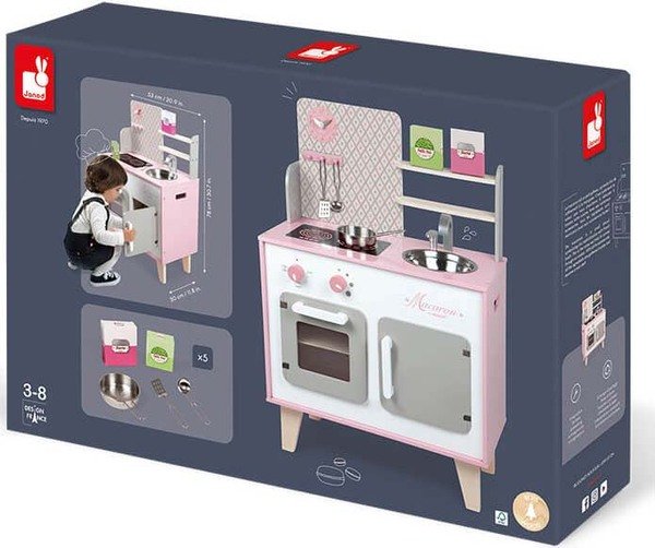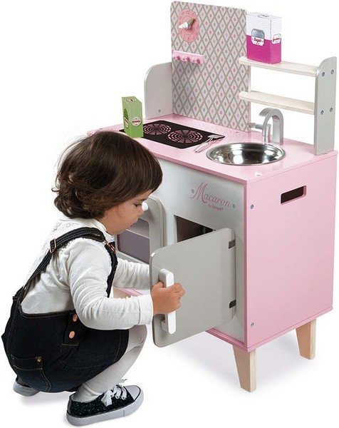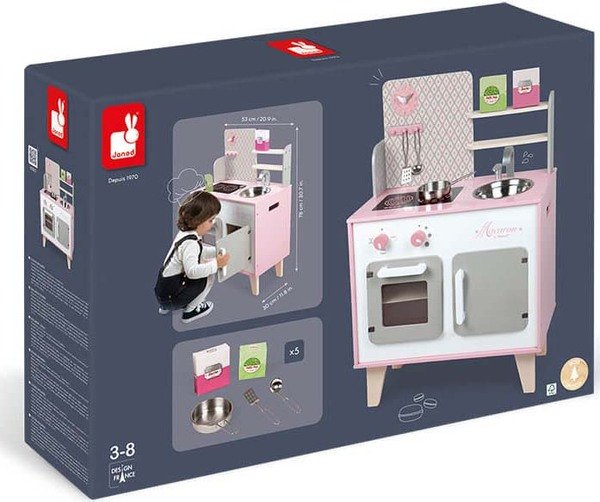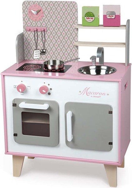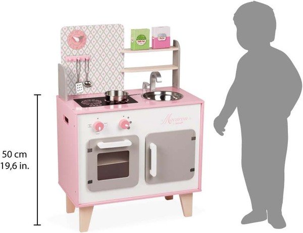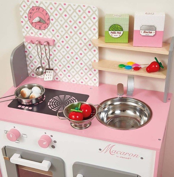 Стать маленьким шефом для своих близких и друзей вместе с игровым набором «Кухня» от Janod - очень легко! Дети смогут представлять себя взрослыми поварами, ведь они так хотят быть похожими на своих родителей. Кухонная поверхность «Macaron Maxi» выполнена в пастельных розовых цветах и непременно понравится любой девочке. Она выглядит как настоящая, здесь есть: часы, варочная поверхность, духовка, шкаф, кухонная мойка, лопатка, черпак, сковородка и 2 коробки с бакалейной продукцией. Кухонные приборы и мойка изготовленные из нержавеющей стали, все остальное - из натуральной и прекрасно обработанной древесины. Дверцы закрываются на магнитах, переключатели варочной поверхности щелкают при оборотах. Собрать кухню не сложно, все крепления в наборе. Размеры кухни - 53х30х78 см.