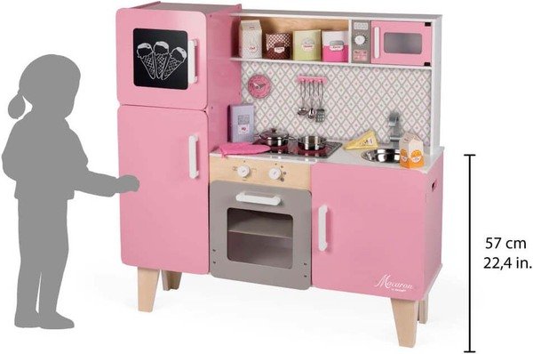 Огромный набор детской игрушечной кухни «Macaron maxi cooker» поражает многофункциональностью и размерами. Варочная поверхность со световыми и звуковыми эффектами, питается от 2-х АА батареек (не входят в комплект). Кухня произведенная из натурального дерева и покрыта безопасными красками. В наборе есть элементы из нержавеющей стали: черпак, лопатка, ложка для спагетти, кастрюлька, сковородка и крышка к ним. Прихватка изготовлена из текстиля. 7 коробок с бакалейной продукцией из плотного картона. Также на кухне есть мойка, доска для записей, микроволновка, духовка, холодильник - в последних дверцы закрываются на магнитах.