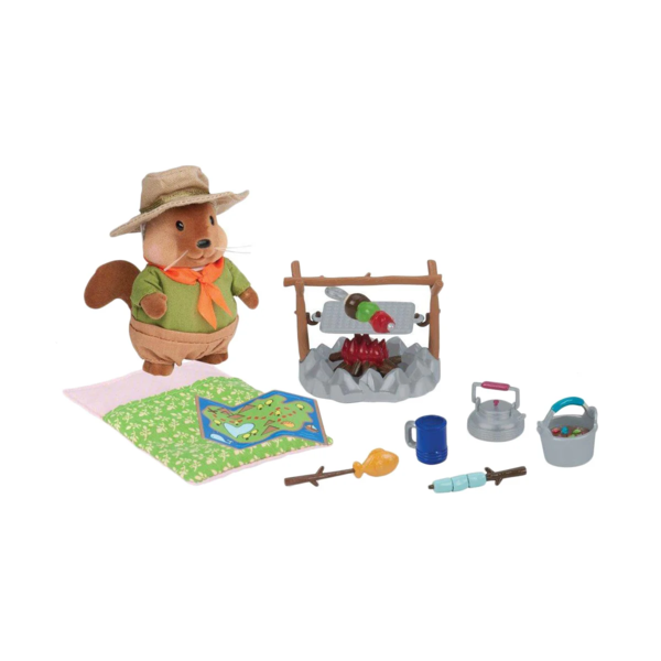 Комплектация 17 предметов: бельчонок, экипировка, шляпа,спальный мешок, карта, чайник, чашка, казан, костер, яма для костра, 2 пожарные ямы, вертел для костра, гриль, овощной шашлык, зефир на палочке, рыбка на палочке. Высота фигурки: 6 см.