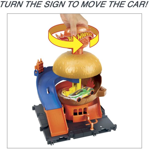 Поверните знак, и машина автоматически проедет через ресторан, но будьте осторожны! Есть доказательства того, что существа тоже сделали пит-стоп! Переместите кетчуп и пролетите над пламенным бройлером, прежде чем мчаться навстречу другим приключениям. Этот набор соединяется с другими игровыми наборами и треками Hot Wheels с помощью нескольких точек соединения, чтобы дети могли создать эпический городской пейзаж по собственному дизайну. Один автомобиль Hot Wheels входит в набор, чтобы можно было сразу же играть в гонки.