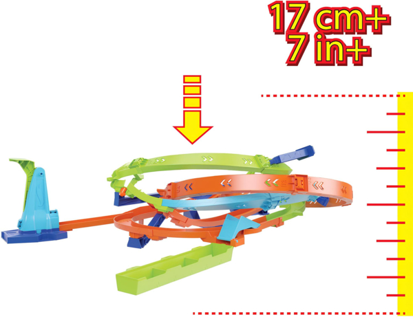 Почувствуйте настоящую мощь и скорость вместе с увлекательным набором Hot Wheels «Испытания гиперпетли». Этот увлекательный набор предлагает два режима игры: запустите машинку через петлю-бумеранг для непрерывных гонок или выполняйте прыжки, зарабатывая баллы. В обоих режимах машинки мчатся через захватывающие петли и крутые повороты, демонстрируя невероятную скорость и зрелищные трюки.