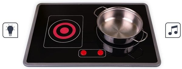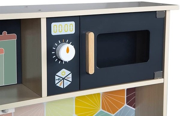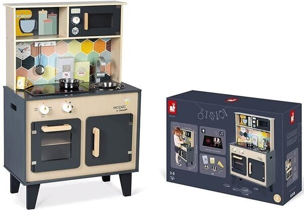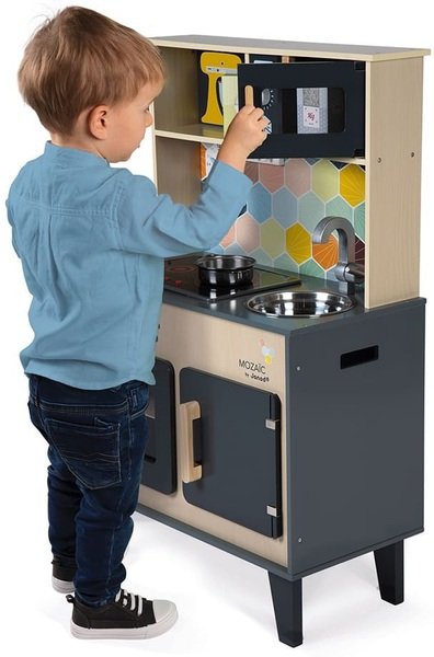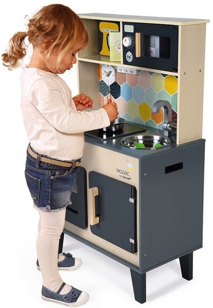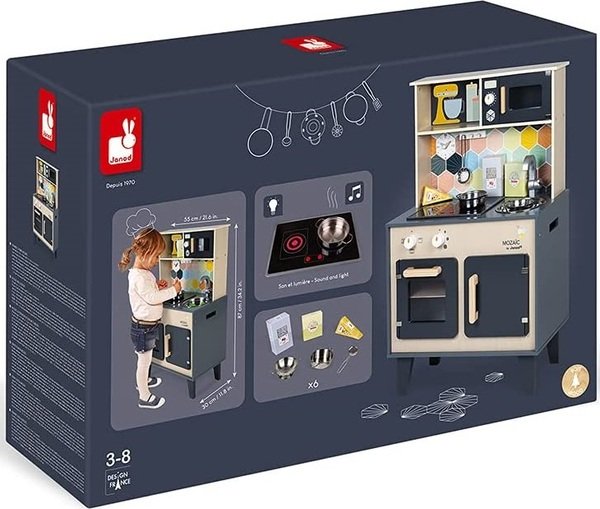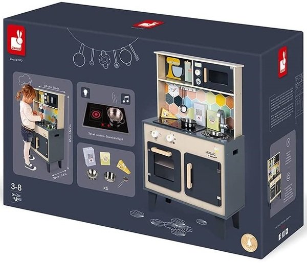 Детский кухонный гарнитур с настоящим характером! Красивое сочетание натурального дерева, черной краски и цветной мозаики придает всему этому действительно стильный вид. Дети, творящие на такой кухне, обязательно придумают несколько новаторских рецептов! Так что дайте волю их воображению и посмотрите, как далеко может унести их вдохновение от мамы и папы! На большой кухне, выложенной мозаикой из дерева, есть крючки, на которые можно повесить 1 шумовку, 1 сковороду, 1 металлический дуршлаг и 3 коробки с едой из картона (сыр, мука, рис). Как и настоящая кухня, она оборудована индукционной плитой со светодиодной подсветкой и настоящими звуковыми эффектами. Просто нажмите красные кнопки один раз, чтобы включить тарелки, а затем второй раз, чтобы услышать звук кипящей воды в кастрюле. Звуковая и индукционная варочные панели автоматически отключаются через 30 секунд или при третьем нажатии красных кнопок. Эта красиво оформленная, полностью оборудованная кухня также включает в себя духовку, микроволновую печь, шкаф, 3 поворотные ручки со звуковыми эффектами, раковину из нержавеющей стали и часы. В комплекте 6 принадлежностей. Высота столешницы: 50 см. Используется 2 щелочные батареи (LR6, 1,5 В). Батарейки в комплект не входят. Размеры: 55 х 30 х 87 см. Для детей от 3 лет.