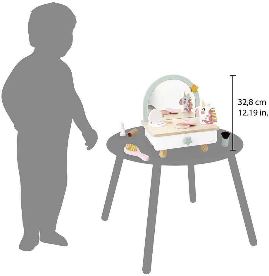 Идеально подходящий для детей от 3 лет, этот маленький деревянный туалетный столик - идеальная игрушка-имитация, которую можно подарить поклоннику единорога! В комплекте с 7 аксессуарами он позволяет подражать взрослым, собираясь перед зеркалом, или баловать любимых пупсов и кукол, играя в ученика парикмахера. Компактный размер позволяет легко разместить его на высоте детского роста, например, на столе, парте или комоде, или на полу, чтобы устроить посиделки в салоне красоты!