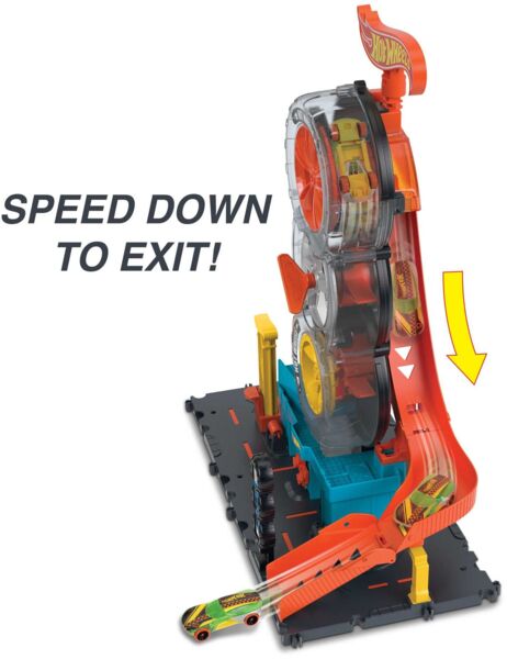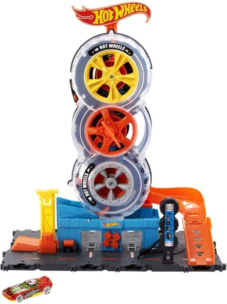 Достигнув вершины, они съезжают по пандусу вниз, навстречу новым приключениям. Основа набора соединяется с другими наборами Hot Wheels и может использоваться с дополнительными элементами трека Hot Wheels, чтобы дети могли построить собственный мир каскадеров и гонок. В набор входит одна машинка Hot Wheels, но из-за конструкции из шин могут проехать до четырех одновременно. Реалистичные детали, такие как подъемник, активируемый ребенком, вращающийся дисплей и бензонасос расширяют возможности для рассказа истории.