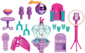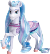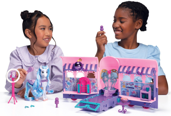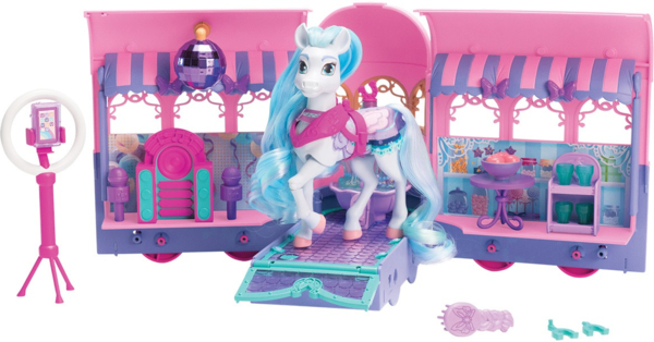 Юху-у-у-у! Собираемся на супервечеринку с Перлой в ее невероятном трейлере развлечений. Здесь есть все и даже больше: уголок караоке, подиум с подсветкой, фотозона, фонтан с пузырями и место со вкусностями. Перла настоящая звезда вечеринок, она дарит всем веселье и позитивный настрой. Ее красочные голубовато-синие пряди в гриве и хвосте отражают ее позитивный зажигательный характер и, что она экстраверт.