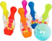 Ребенку необходимо за наименьшее количество бросков сбить все кегли с помощью шара. Когда вы сбиваете кегли точным ударом, разноцветные шарики будут подпрыгивать внутри, добавляя безумного веселья к классической игре. А благодаря подставке боулинг удобно брать с собой куда угодно.