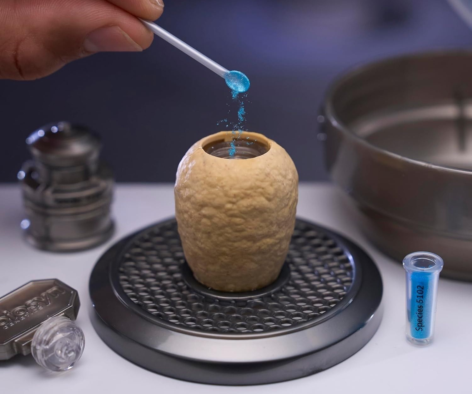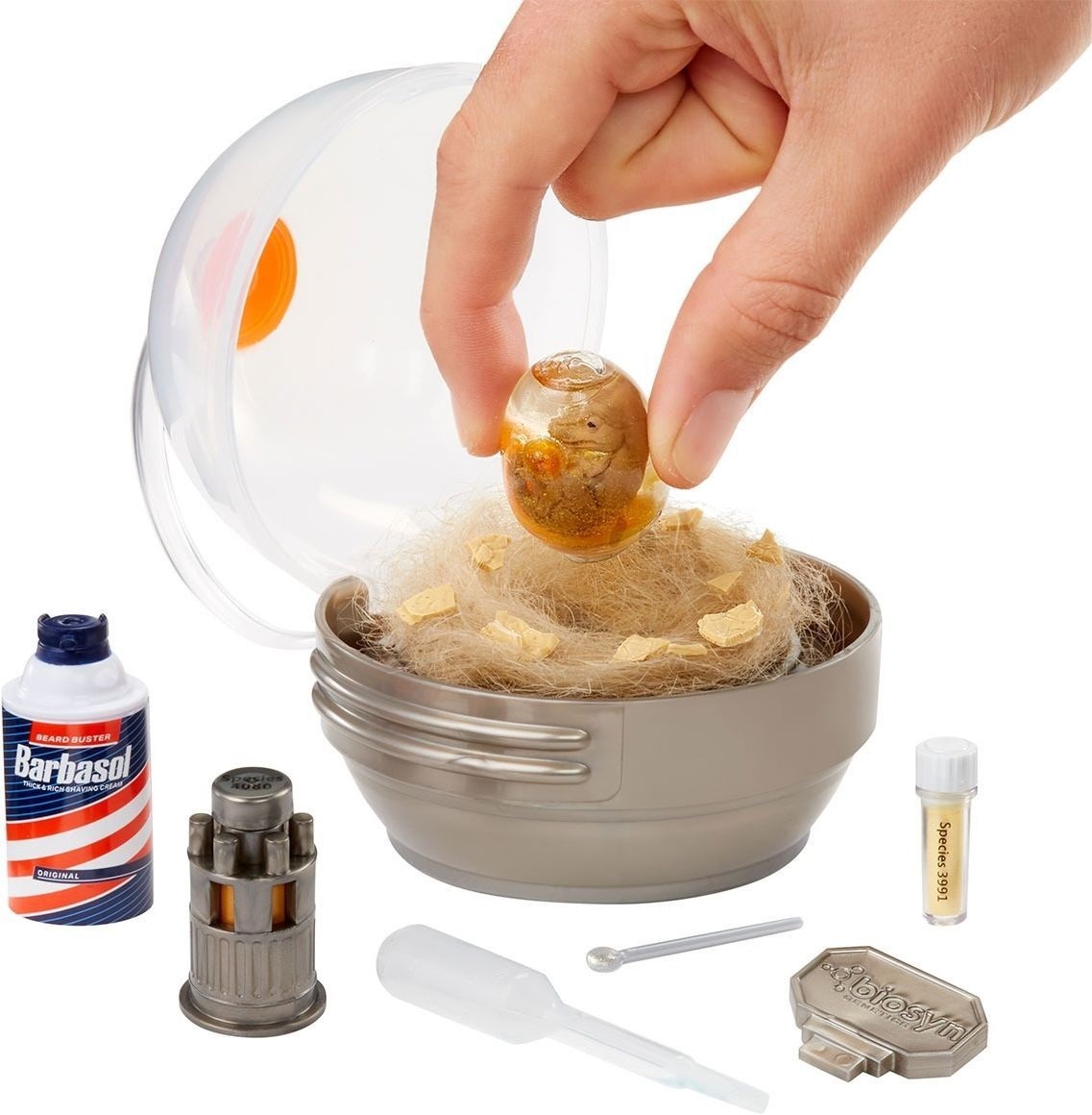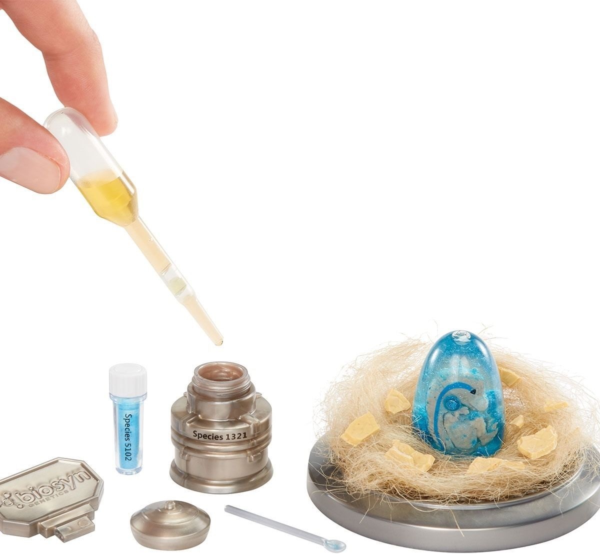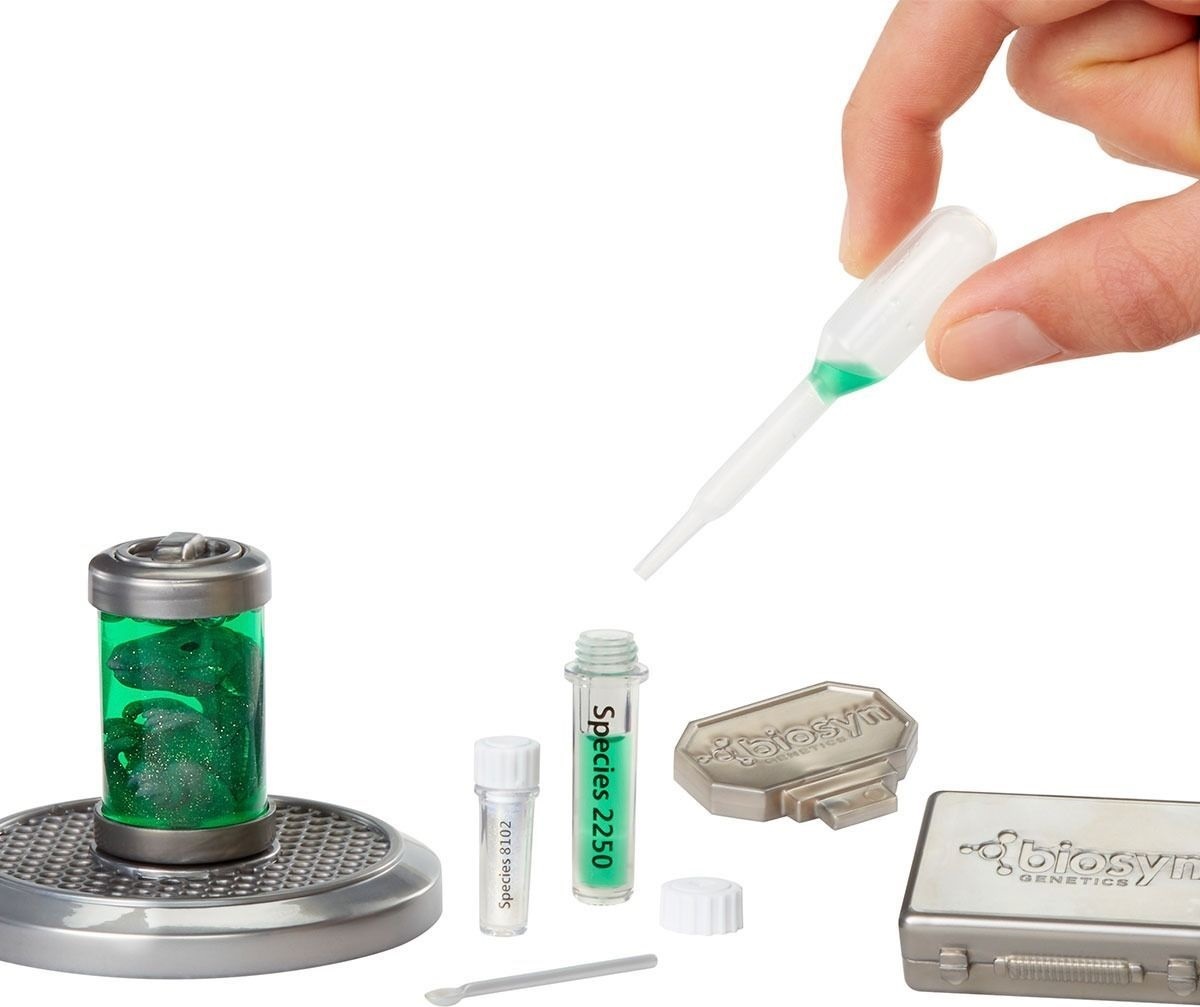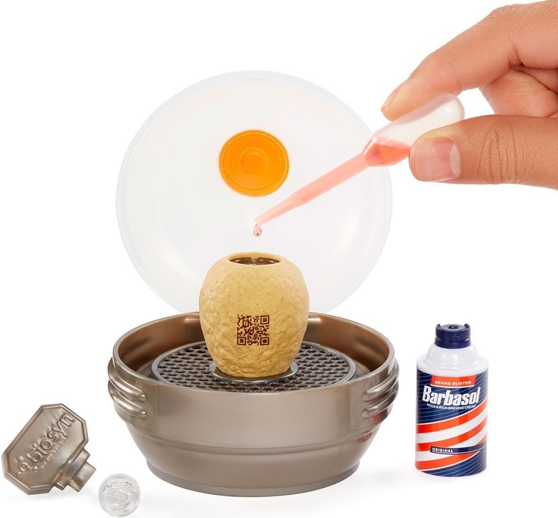 Сравните содержимое шарика с письмом коллекционера, чтобы определить, какой динозавр попал именно к вам. По инструкции введите "глиттерный ДНК-порошок" и жидкость в яйцо или цилиндр, встряхните — и наблюдайте, как появляется ваш игрушечный динозавр. Это научный эксперимент в миниатюре.
