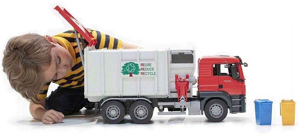 Эта замечательная игрушка Bruder является точной копией реального мусоровоза с боковой загрузкой на базе MAN TGS. Эта спецтехника очень необходима для города, ведь позволяет оперативно избавляться от различных отходов перед дальнейшим их переработкой.