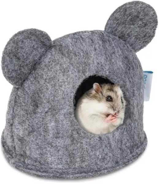 Милый домик с ушками станет украшением клетки и надежным укрытием для любимца. В таком симпатичном доме очень уютно спать и отдыхать! А при желании можно разместиться даже небольшой компанией. Войлок — плотный и прочный материал, легко очищается от грязи и долго сохраняет привлекательный вид. Небольшой круглый вход имитирует норку, поэтому любимец будет чувствовать себя, как дома.
