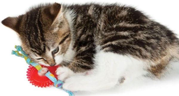 Petstages Kitty Chew Wheel - игрушка для кошек в форме колеса. Изготовлена из чрезвычайно упругого и выносливого материала, котики с радостью будут играть и жевать игрушку. По краям игрушки есть две веревки, за которые кот сможет удобно хвататься зубами и переносить ее по комнатам. Зубцы на круге помогут очистить зубки вашего питомца от налета.