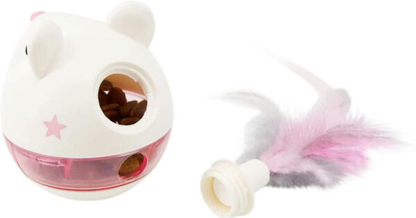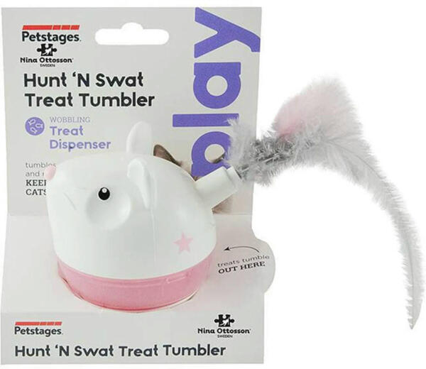 Nina Ottosson Hunt`N Swat Treat Tumbler - интерактивная игрушка-головоломка для кошек. Выполнена в форме мышки-неваляшки, имеет отделение для корма, чтобы его открыть открутите хвостик мышки и добавьте в отверстие немного корма. Почувствовав аромат вкусненького, ваш питомец начнет толкать игрушку лапами, во время колебания из нее будут выпадать гранулы корма. Игрушка не только развлечет вашего котика, но и поможет развить логику и природные инстинкты добывания пищи.