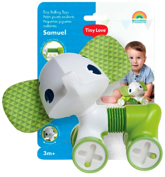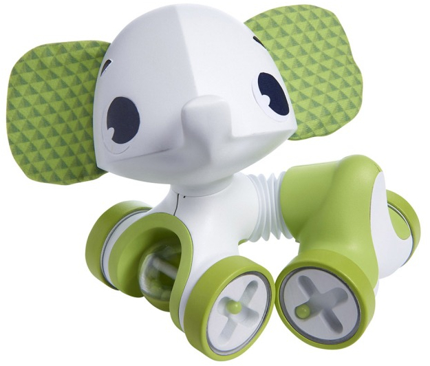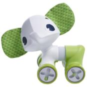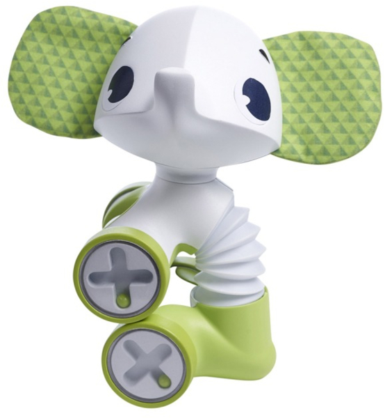 Слоненка можно катать за собой на веревочке или толкать вперед-назад. Благодаря инновационному туловищу-гармошке игрушку можно растягивать, поворачивать и даже посадить. Голова вращается в разные стороны, издавая при этом характерный треск. Во время движения каталки в ее колесиках передвигаются бусинки, создавая эффект погремушки. Дополнительный шумовой элемент - прозрачный шар с бусинками, расположенный под головой, что делает игру еще интереснее.